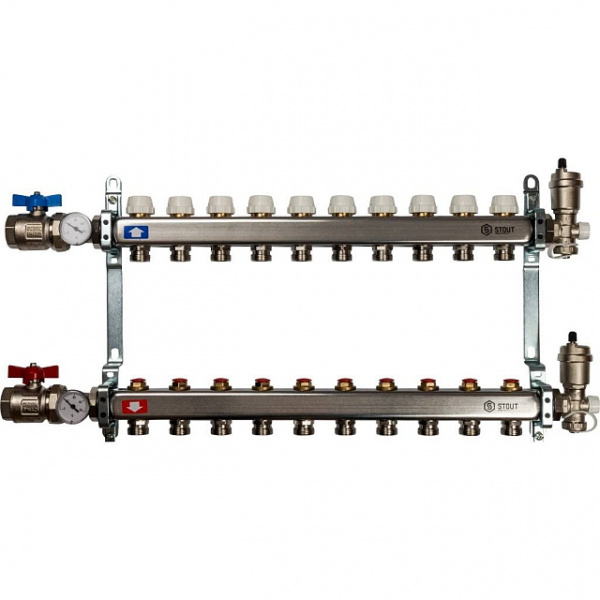 2. Каждый коллекторный блок состоит из подающего и обратного коллекторов из нержавеющей стали, балансировочных и регулирующих клапанов, а также других компонентов, таких как тройники, воздухоотводчики, дренажные клапаны и кронштейны.
